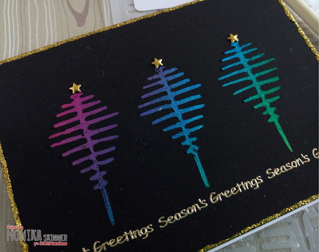 You simply place the stencil on the black side of the card and scratch the black paint off using the tool from the kit ... and you end up with lovely foil trees!